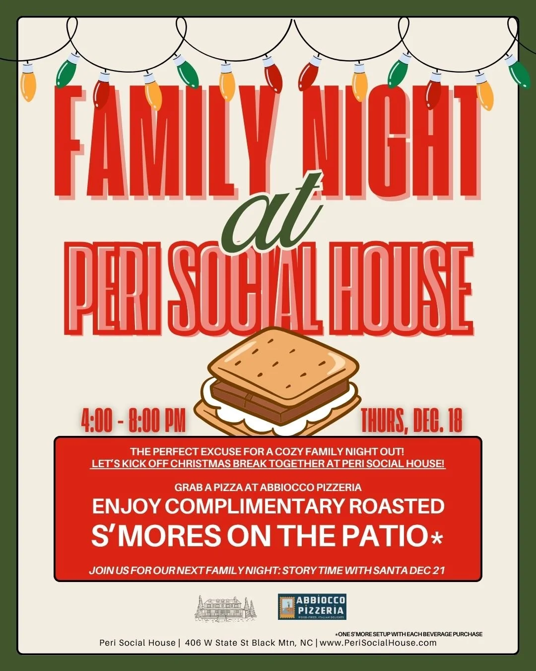 It’s family night at Peri Social House! Join us as we kick off Christmas break. Abbiocco wood fired pizza truck will be serving up dinner. Adult and kid-friendly beverages available at the bar. Receive a complimentary s’mores kit when you stop on by.