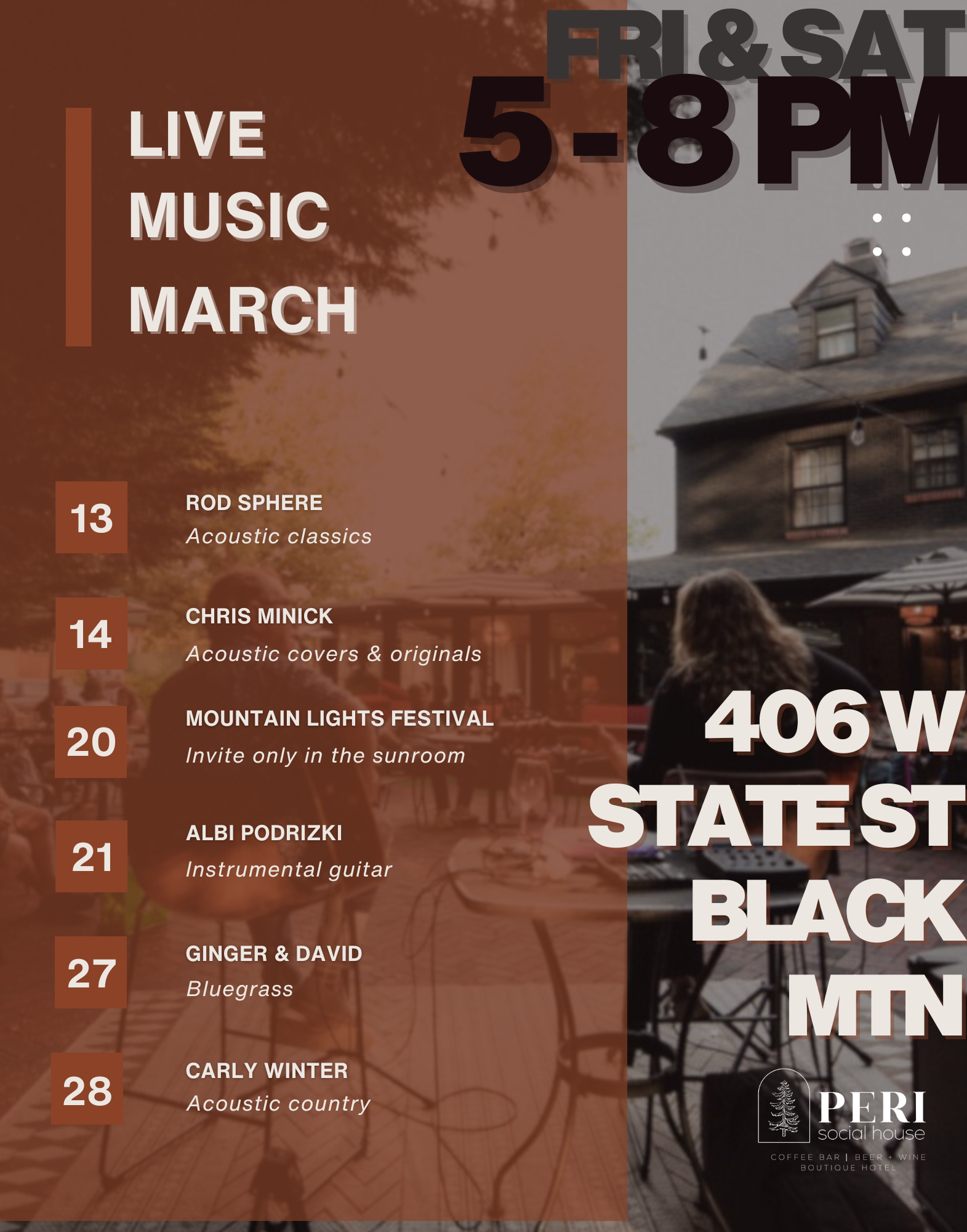 Back to All Events Live Music : Every Friday + Saturday Wednesday, March 11, 2026 5:00 PM Tuesday, March 31, 2026 8:00 PM Google Calendar ICS
