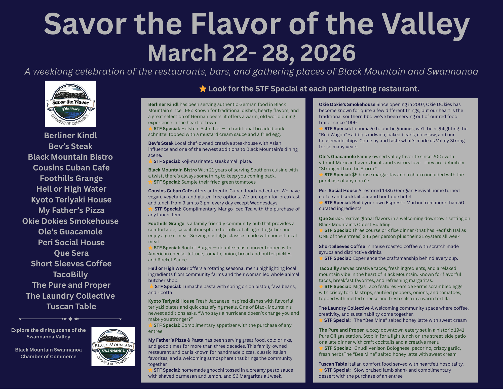 A weeklong celebration of the restaurants, bars and gathering places of Black Mountain and Swannanoa!